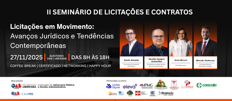 A OAB Uberaba, por meio da Comissão de Advocacia Pública e Direito Administrativo, realizará no dia 27 de novembro de 2025 o II Seminário de Licitações e Contratos. O evento, que acontecerá no Auditório da OAB Uberaba das 8h às 18h, será uma oportunidade para advogados, gestores públicos, estudantes e demais interessados aprofundarem conhecimentos sobre os atuais desafios e transformações no âmbito das contratações públicas.